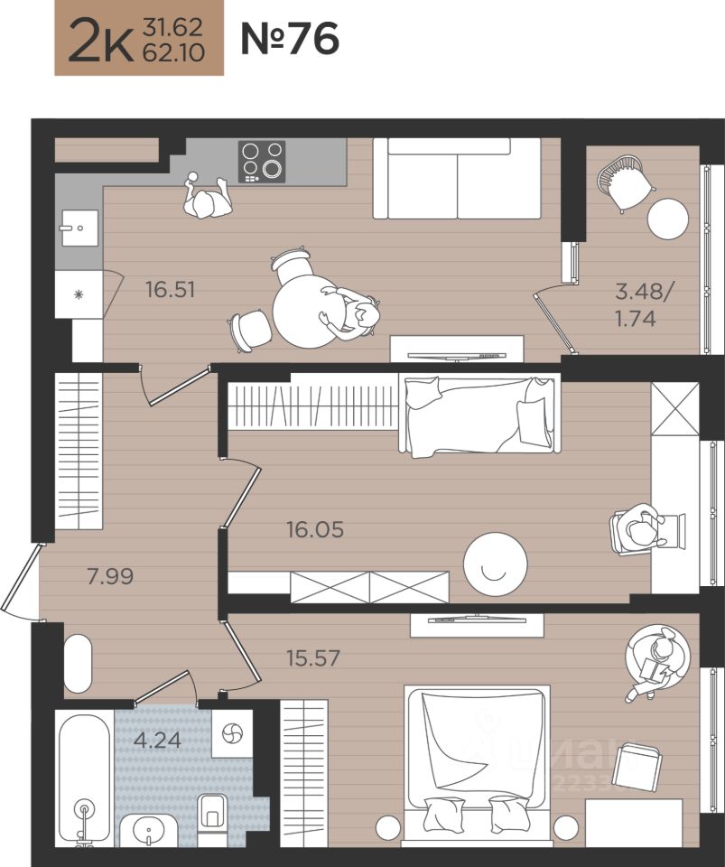 Продаётся комфортабельная 2-комнатная квартира 76 на Советском проспекте, 50 в ЖК "МОЙ ГОРОД"