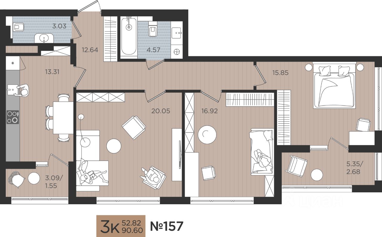 Продаётся комфортабельная 3-комнатная квартира 157 на Советском проспекте, 50 в ЖК "МОЙ ГОРОД"