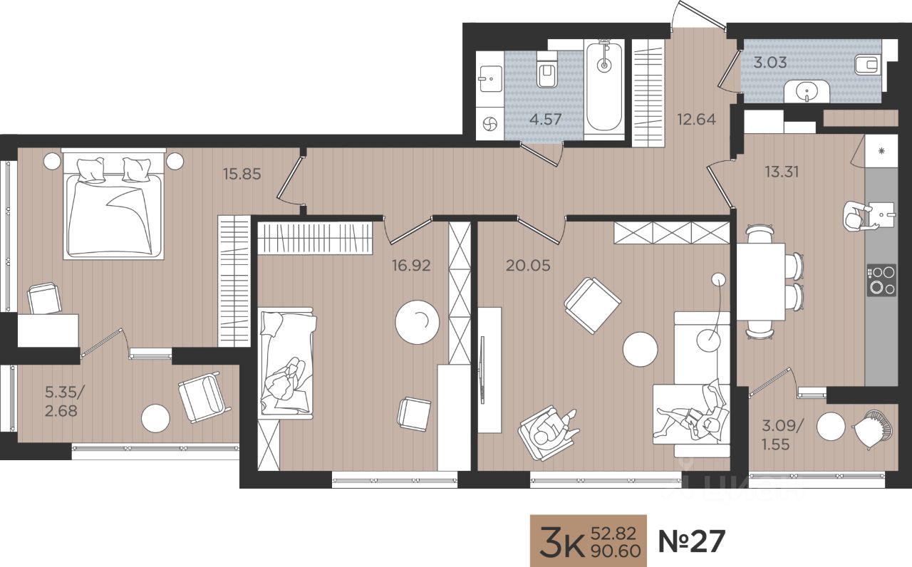 Продается комфортабельная 3 комнатная квартира 27 на Советском проспекте, 50 в ЖК "МОЙ ГОРОД"