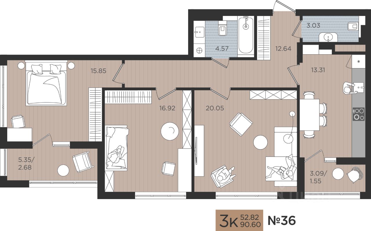 Продается комфортабельная 3 комнатная квартира 36 на Советском проспекте, 50 в ЖК "МОЙ ГОРОД"
