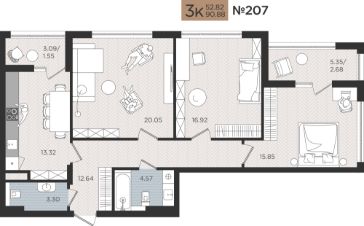 Продается комфортабельная 3 комнатная квартира 207 на Советском проспекте, 50 в ЖК "МОЙ ГОРОД"