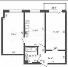 Квартира находится на 5 этаже пятиэтажного блочного дома 1995 года постройки. Высокие потолки (2,7 м) создают ощущение простора и свободы. Жилая площадь составляет 33,1 кв. м, а кухня — 14 кв. м. Две изолированные комнаты (17,7 кв. м и 15,4 кв. м) обеспечат уединение и удобство для всех членов семьи.