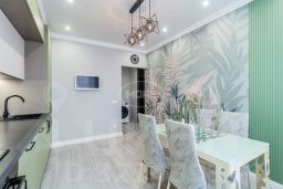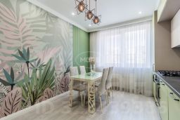 Интерьер был разработан с участием опытного дизайнера Ольги Штенниковой. В квартире мы можем наблюдать мягкие цветовые решения, в стиле "нескучная классика". Для владельцев это прежде всего, создание уникального и гармоничного пространства. Проект отвечал самым требовательным пожеланиям большой семьи, а также, создавался с учетом функциональности и эстетики. Такой ремонт создает комфорт и вдохновение в каждом уголке дома. Для реализации концепции, привлекалась надежная бригада строителей, все виды технических работ выполнены под строгим контролем. Использовались качественные материалы. На кухне выполнена художественная роспись стены вручную.