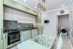 Просторная кухня выходит на солнечную сторону. Большой кухонный гарнитур, позволяет удобно организовать пространство для приготовления. Несколько сценариев освещения, создают особый шарм, можно менять яркость света в зависимости от настроения и времени суток. Например, "поярче" включать можно во время готовки, мягкий свет для ужина и теплую приглушенную подсветку для отдыха.