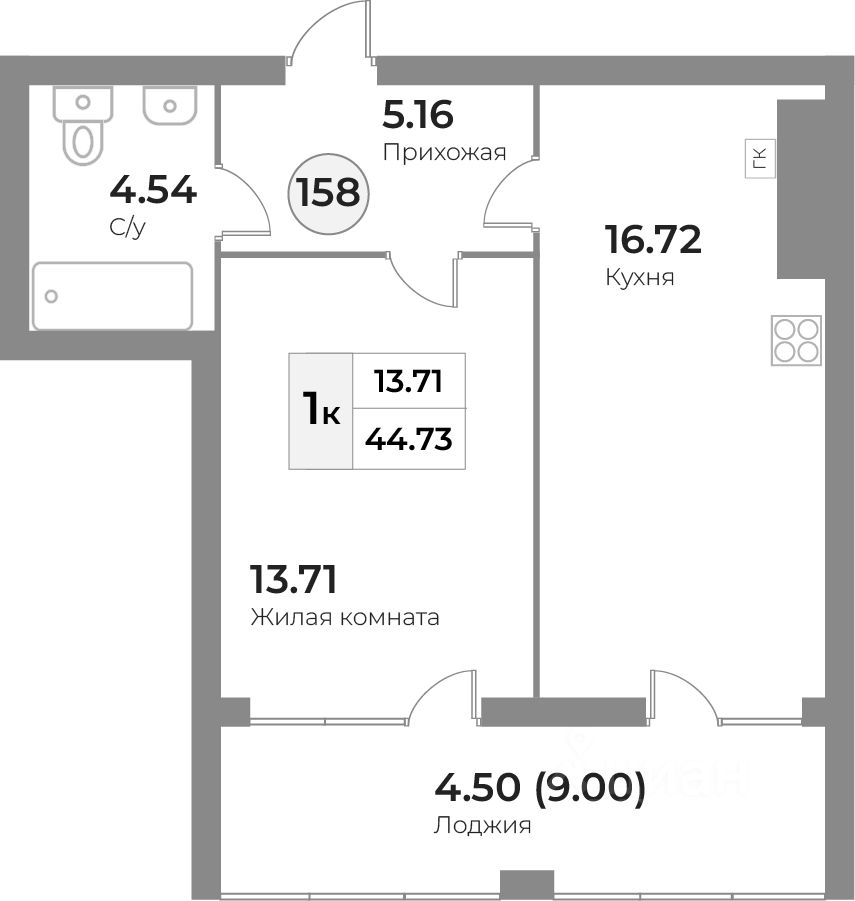Продается 1-комн. квартира, 44,63 м²