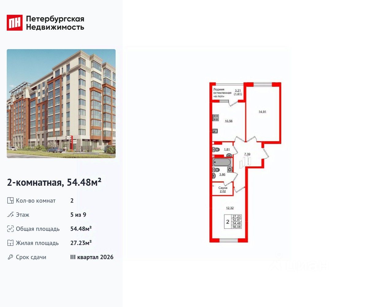 Удобная, классическая планировка, кухня 10.56 м², вместительная прихожая 7.39 м². Общая площадь квартиры - 54.48 м², жилая 27.23 м², высота потолка 2.7 м.