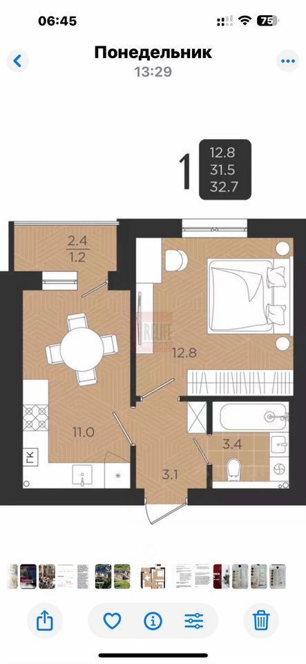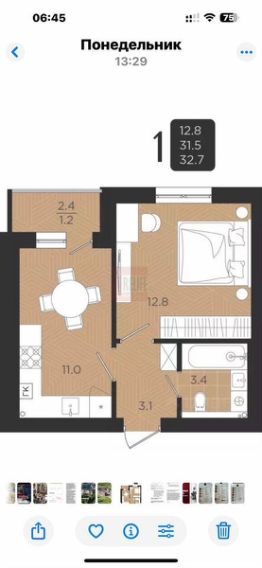 Общая площадь квартиры 32.7 кв. м. Просторная комната 12,8 кв. м, функциональная кухня-гостиная 11 кв. м, с выходом на застекленную лоджию 2,4 кв. м. для приятных вечерних посиделок с прекрасным обзором окрестностей.