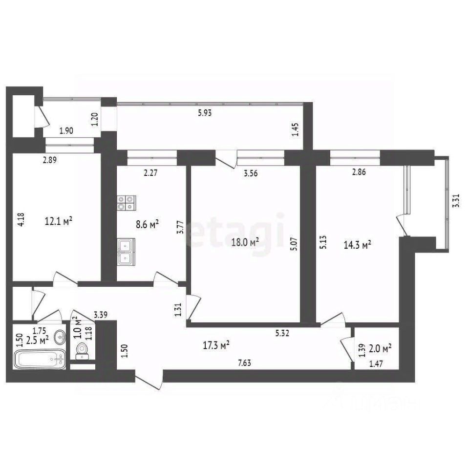 -Комнаты -18 м2; 14,3 м2; 12,1 м2