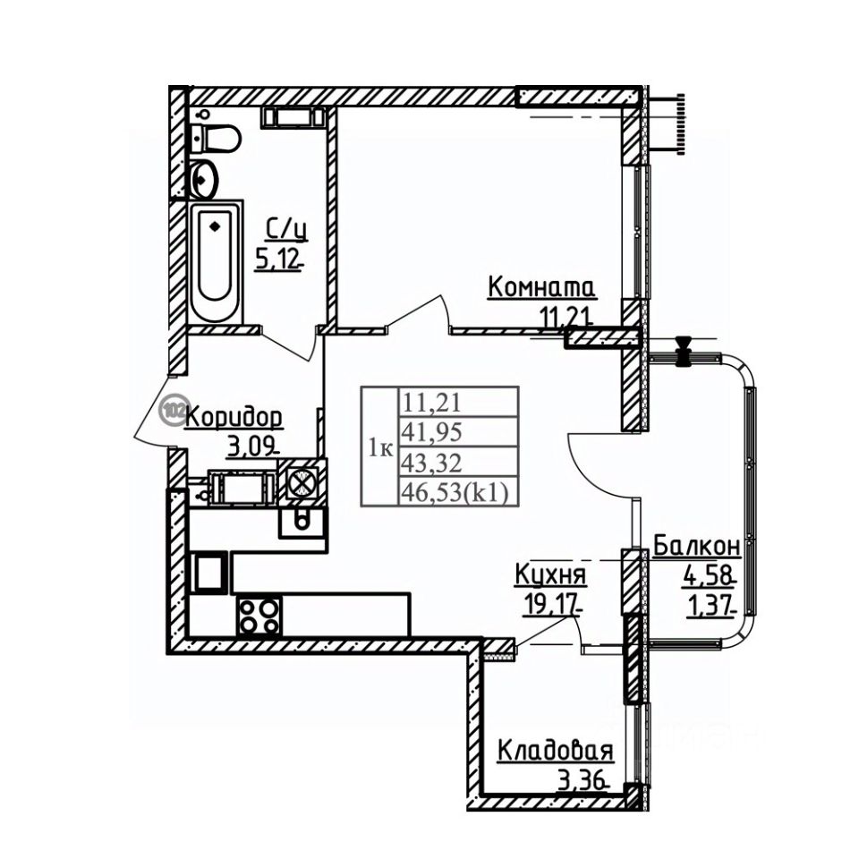 Общая площадь43,32 м²