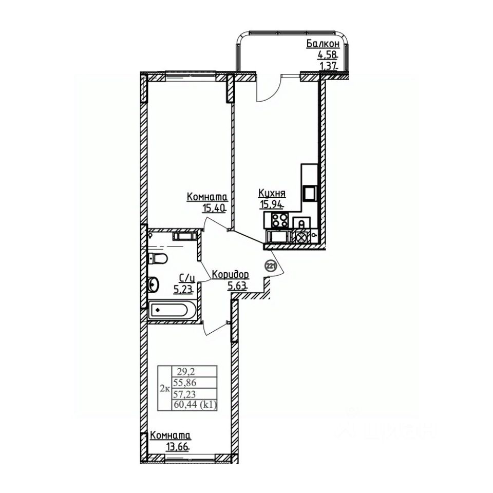 Общая площадь57,23 м²