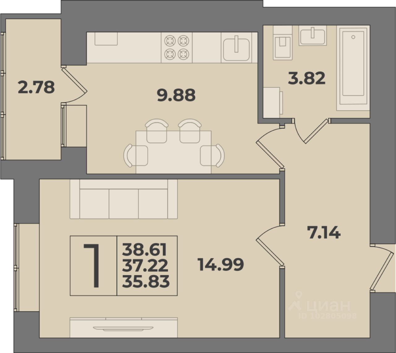 Общая площадь38,61 м²