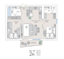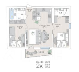 Продаётся 2-комнатная квартира в строящемся доме (Дом 16), срок сдачи: I-кв. 2027, общей площадью 68.8 кв.м., на 4 этаже. "О2" - малоэтажный жилой комплекс европейского комфорт-класса от застройщика "Дом Инвест".