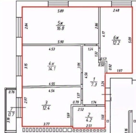 Общая площадь квартиры составляет 67 кв. м, из которых 43,1 кв. м — жилая площадь. Три изолированные комнаты (16,8 + 14,1 + 12,2 кв. м) позволяют организовать пространство с учётом потребностей каждого члена семьи. Высота потолков 2,7 м создаёт ощущение простора и свободы.