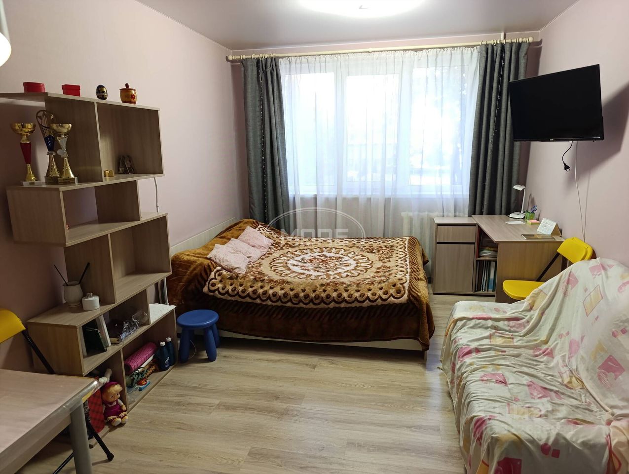 Общая площадь комнаты составляет 17,3 кв. м. Высота потолков — 2,75 м. Стеклопакеты на окнах.