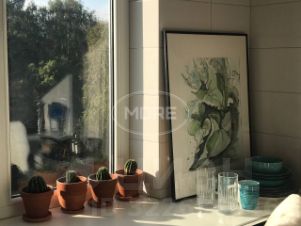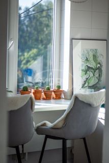В квартире светло и уютно, с окон видно тихий зеленый двор и крыши соседних домов после реставрации. Открытый балкон с живой зеленью и новой плиткой на полу.