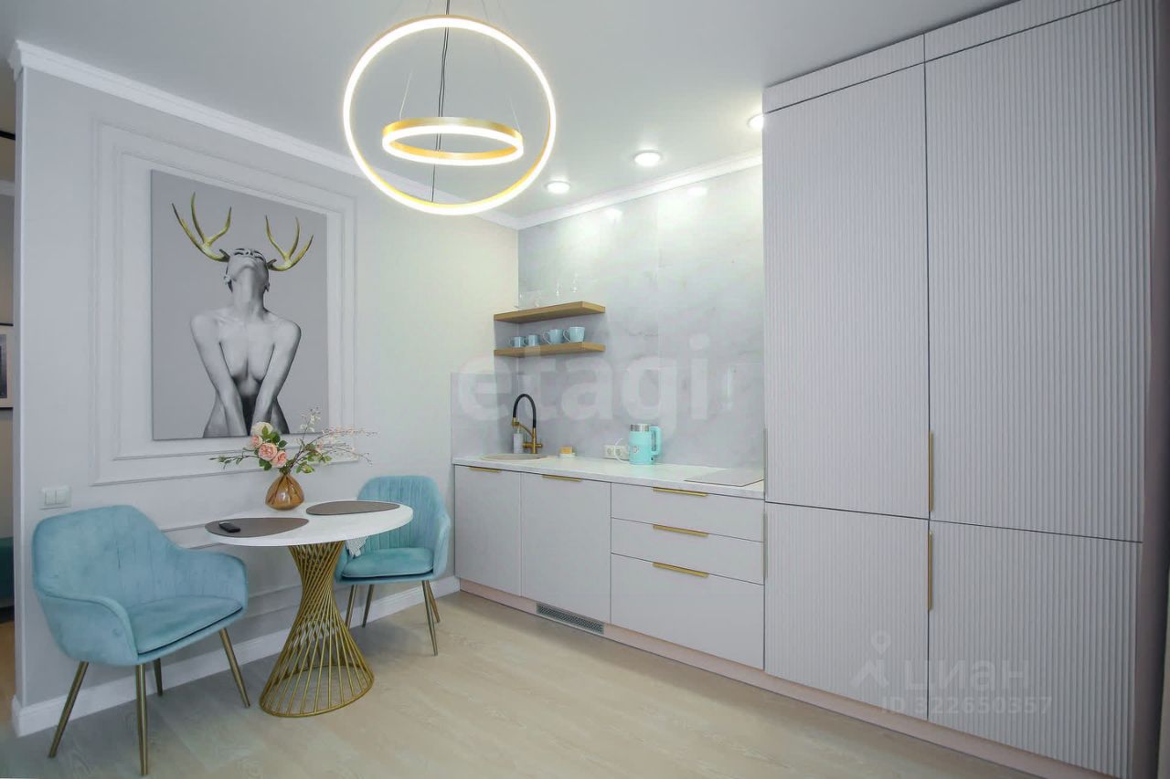 - Кухня оснащена варочной панелью, встроенным холодильником и микроволновой печью — все необходимое для комфортного проживания.