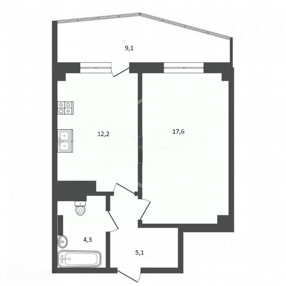 - 1 изолированная комнаты (17,6 кв.м), кухня (12,2 кв.м), застеклённая большая лоджия (9,1 кв.м).