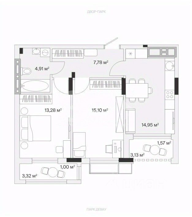 Спальня (13.28 кв.м.) ,вторая комната (15.10 кв.м.), большой санузел
