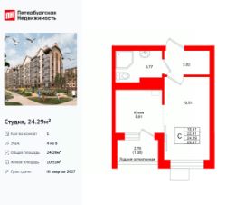 Удобная, классическая, функциональная европланировка, большая кухня-гостиная 5.61 м², вместительная прихожая 3.02 м². Общая площадь студии - 24.29 м², жилая 10.51 м², высота потолка 3 м.
