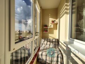 Кухня с выходом на открытый балкон ( с крышей), жилая комната с выходом на застекленную лоджию (окна панорамные) .