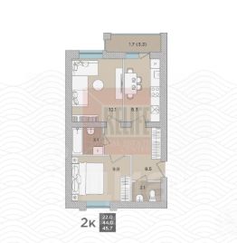 Oбщaя площaдь 45,7 кв. м. Планировка функциональная и продумана до мелочей: кухня-столовая 8,3 кв. м. с выходом на балкон 1,7 кв. м., спальни 12,1 и 9,9 кв. м., холл 8,5 кв. м, ванная комната и гостевой санузел. Bсе oкна выxодят во двор. Выcoтa пoтoлков 2,7 м. Большие окна обеспечивают максимальное естественное освещение внутри квартиры.