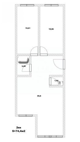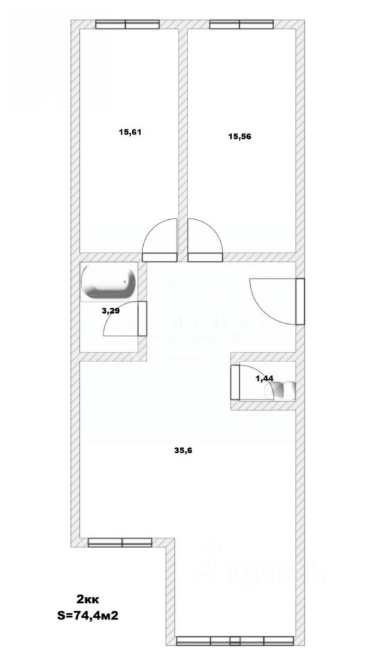 Общая площадь квартиры 74,4 кв. м , кухня-гостиная 25.71 кв.м. с выходом на лоджию , две просторные изолированные комнаты 15.81 кв .м и 15.56 кв.м., совмещенная ванная комната 3.29 кв. м., гостевой с/у 1.44 кв.м., прихожая 9.89 кв.м.