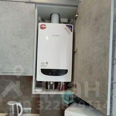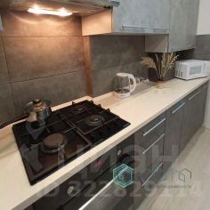 В кухне современный гарнитур, газовый котёл, пожарные извещатели, газовая варочная поверхность (чёрное стекло), электрический встроенный духовой шкаф, вытяжка с подсветкой, микроволновка, холодильник, раздвижной стол, стулья, посуда.