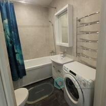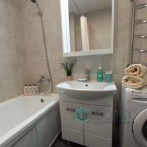 В квартире матовые натяжные потолки, на стенах обои и плитка, в холле и санузле на полу керамическая плитка, в других помещениях ламинат. Лоджия с панорамным остеклением в пол, выход из кухни. В санузле тёплый пол, вся сантехника в исправном состоянии( ванна, раковина с тумбой, унитаз, смесители, полотенцесушитель), стиральная машина, зеркало с подсветкой.