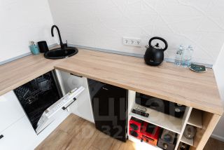 Полностью оборудованная кухня с эл. плитой, посудомоечной машиной, холодильником, микроволновой печью, чайником.
