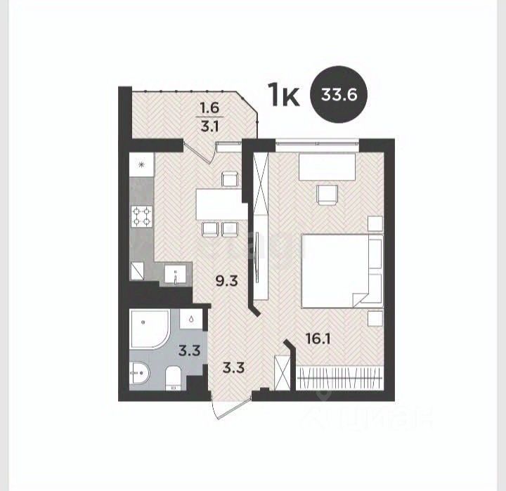 Уютная 1х-комнатная квартира, общей площадью 33,6 кв.м. с просторной кухней 9,3 кв. м. и большой спальней 16,1 кв. м.
