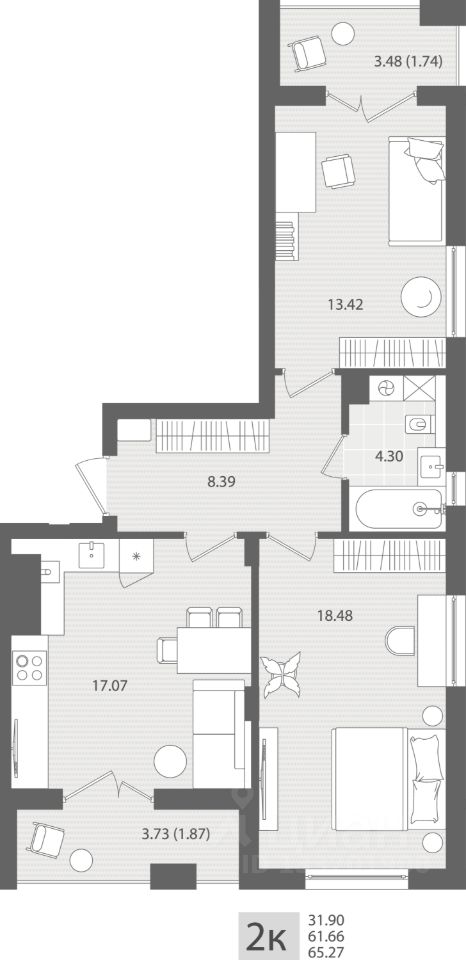 Продаётся 2-комнатная квартира в строящемся доме (Дом 1.3), срок сдачи: III-кв. 2027, общей площадью 65.27 кв.м., на 1 этаже. Новый жилой комплекс "МОре" от Строительной компании "Меркурий" расположен по адресу: Калининградская область, г. Пионерский, пос. Рыбное.