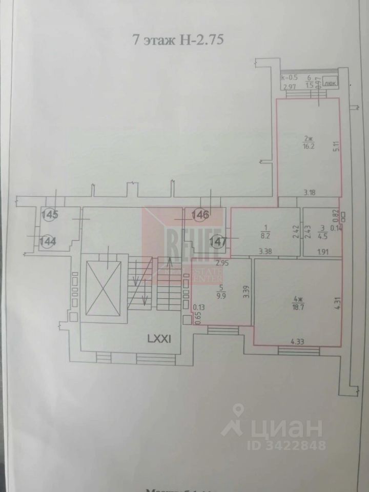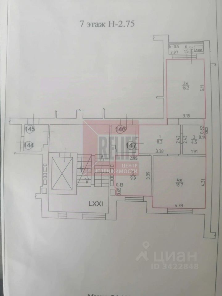Расположена на 7 этаже 9 этажного дома из красного керамического кирпича 2015 г. постройки.