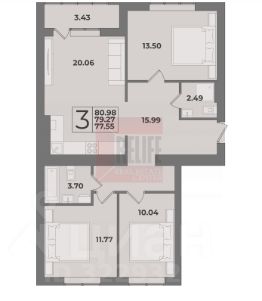 Общая площадь квартиры 80,98 кв. м, комнаты 10,04+13,50+11,77 кв. м., кухня-гостиная 20,06 кв. м. с выходом на лоджию. Два санузла.