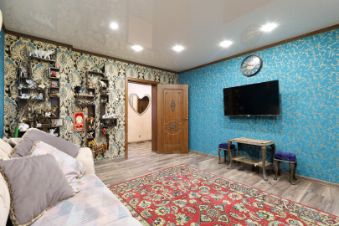 В квартире высокие потолки (2,85), сделан современный свежий дизайнерский ремонт. Отделка стен - обои, декоративная шпаклевка, полы-ламинат, плитка, керамогранит. Санузел 4,1 м кв, установлена ванна-джакузи.