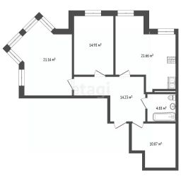 Планировка включает две изолированные спальни, большую кухню-гостиную площадью 22 кв. м. и уникальное по своим размерам помещение гардеробной 11 кв. м., которое можно функционально использовать под хранение вещей, мини-кабинет или спортзал. Одна из комнат размером 21 кв. м. с панорамным остеклением.