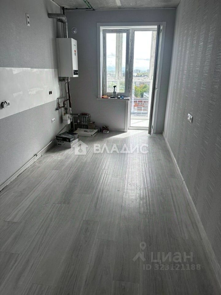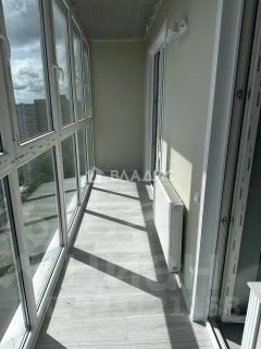 Просторная застекленная лоджия с панорамным остеклением с выходом из комнаты и из кухни.
