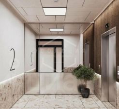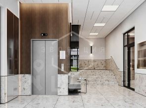 Интерьеры выполнены в минималистичном стиле с контрастными, дополняющими друг друга материалами. Благодаря использованию светлых оттенков, природных текстур и декоративного освещения, пространство имеет большое количество света. В лифт-холле предусмотрена зона ожидания с мягкой мебелью.