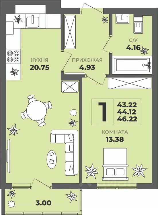 Продаётся 1-комнатная квартира в строящемся доме (Дом 1), срок сдачи: II-кв. 2027, общей площадью 44.12 кв.м., на 1 этаже. ЖК "ГРИНВУД".