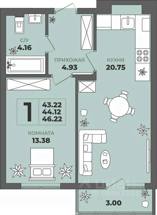 Продаётся 1-комнатная квартира в строящемся доме (Дом 1), срок сдачи: II-кв. 2027, общей площадью 44.12 кв.м., на 1 этаже. ЖК "ГРИНВУД".