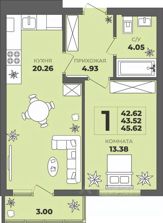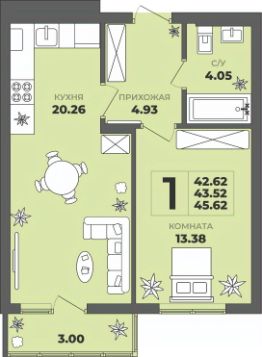 Продаётся 1-комнатная квартира в строящемся доме (Дом 1), срок сдачи: II-кв. 2027, общей площадью 43.52 кв.м., на 7 этаже. ЖК "ГРИНВУД".