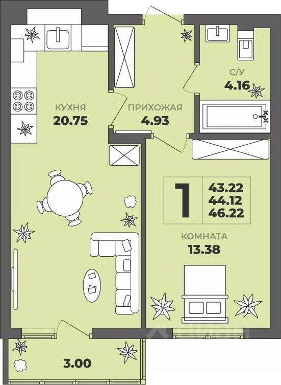 Продаётся 1-комнатная квартира в строящемся доме (Дом 1), срок сдачи: II-кв. 2027, общей площадью 44.12 кв.м., на 1 этаже. ЖК "ГРИНВУД".