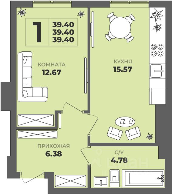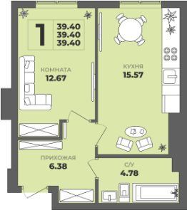 Продаётся 1-комнатная квартира в строящемся доме (Дом 2), срок сдачи: II-кв. 2027, общей площадью 39.4 кв.м., на 1 этаже. ЖК "ГРИНВУД".