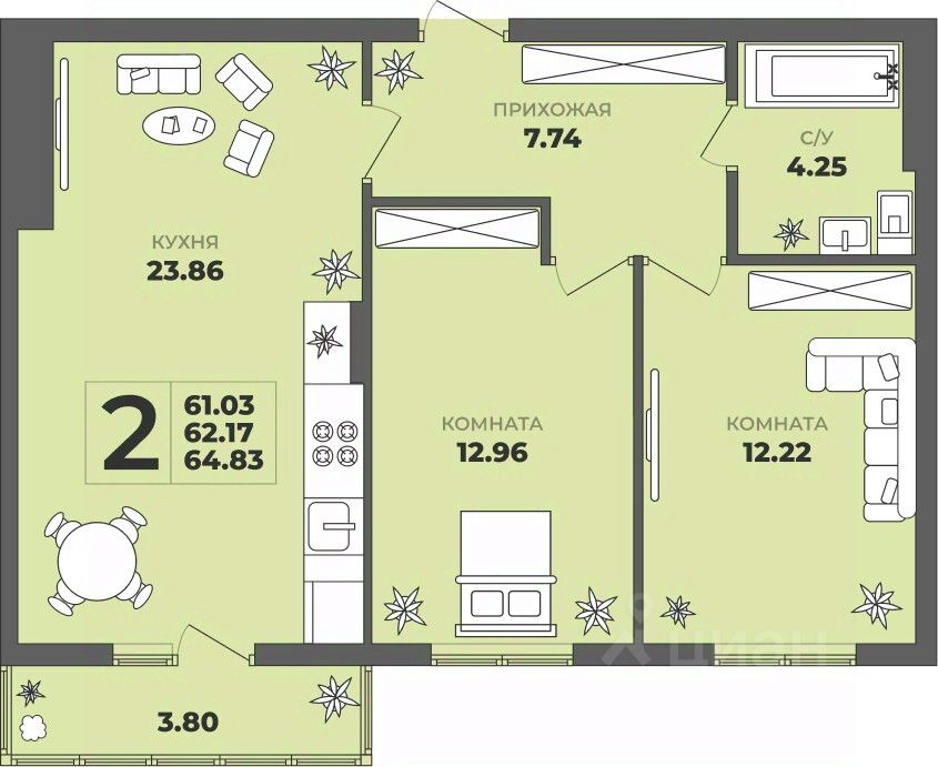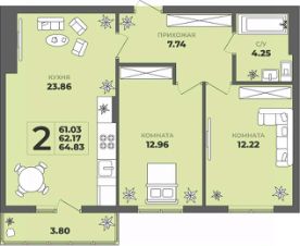 Продаётся 2-комнатная квартира в строящемся доме (Дом 2), срок сдачи: II-кв. 2027, общей площадью 62.17 кв.м., на 1 этаже. ЖК "ГРИНВУД".