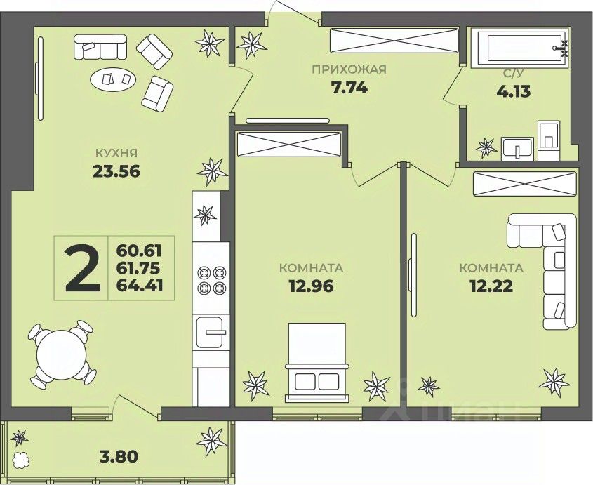 Продаётся 2-комнатная квартира в строящемся доме (Дом 2), срок сдачи: II-кв. 2027, общей площадью 61.75 кв.м., на 2 этаже. ЖК "ГРИНВУД".