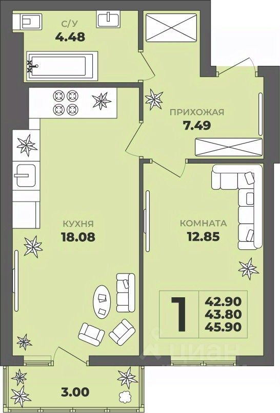 Продаётся 1-комнатная квартира в строящемся доме (Дом 2), срок сдачи: II-кв. 2027, общей площадью 43.8 кв.м., на 8 этаже. ЖК "ГРИНВУД".
