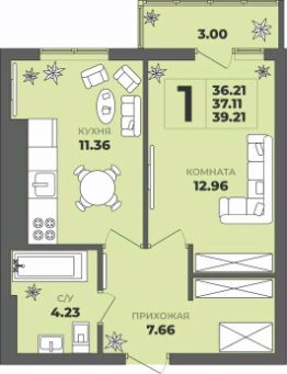 Продаётся 1-комнатная квартира в строящемся доме (Дом 2), срок сдачи: II-кв. 2027, общей площадью 37.11 кв.м., на 8 этаже. ЖК "ГРИНВУД".