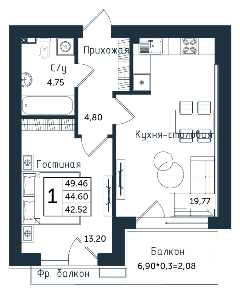 Продаётся 1-комнатная квартира в строящемся доме (Дом 1), срок сдачи: II-кв. 2026, общей площадью 49.46 кв.м., на 3 этаже. Новый жилой комплекс "Янтарные Сезоны" от Группы компаний "Модуль-Стройград" расположен по адресу: Калининградская обл., пгт Янтарный, ул. Советская.