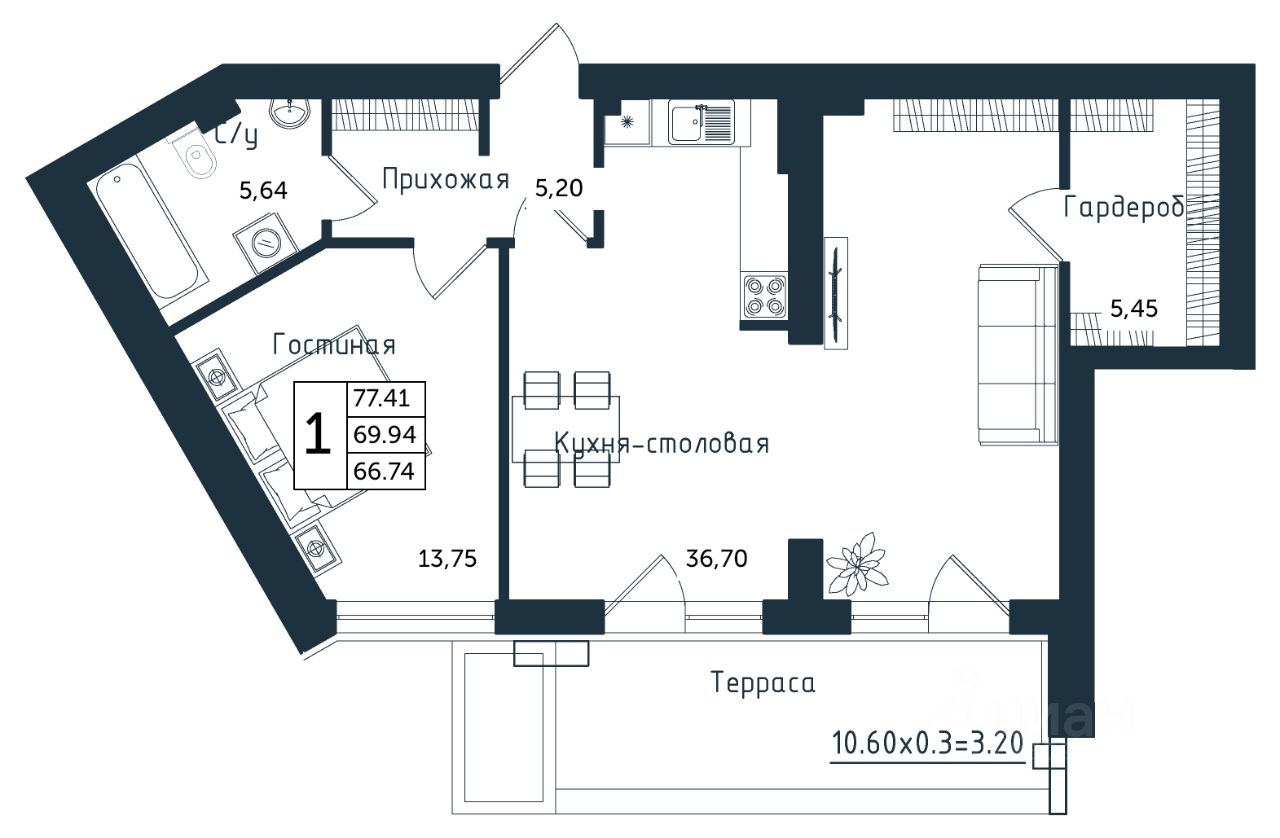 Продаётся 1-комнатная квартира в строящемся доме (Дом 1), срок сдачи: II-кв. 2026, общей площадью 77.41 кв.м., на 1 этаже. Новый жилой комплекс "Янтарные Сезоны" от Группы компаний "Модуль-Стройград" расположен по адресу: Калининградская обл., пгт Янтарный, ул. Советская.