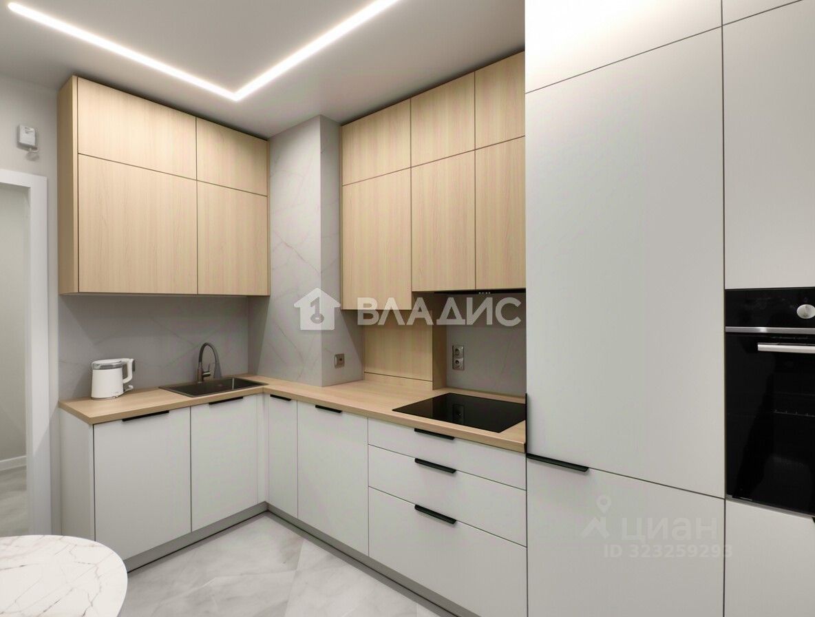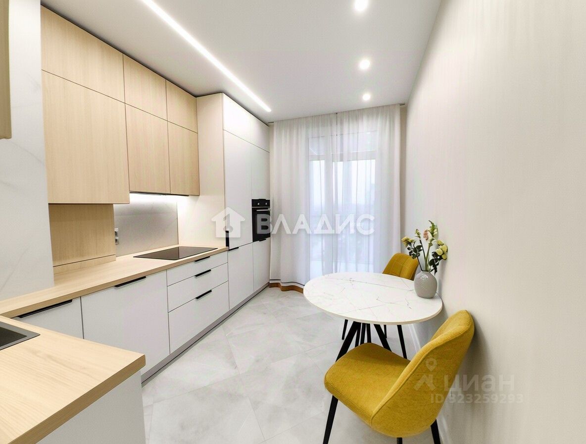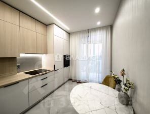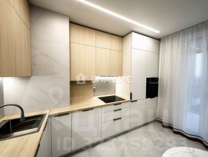 Кухня - 9,5 м2. Полы - керамогранит, система теплого пола. Встроенный кухонный гарнитур. Вся техника уже встроена (холодильник, посудомоечная машина, вытяжка, индукционная печь, духовой шкаф). На кухне натяжной потолок со световыми линиями и точечными светильниками.