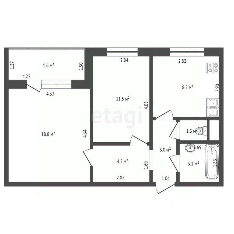 Общая площадь квартиры:50.4 кв.м., площадь кухни 8,2 кв.м., просторные комнаты 11.5 кв.м., 18.8 кв.м., санузел раздельный: ванна 3.1 кв.м., туалет 1.3 кв.м., коридор 3.0 кв.м., есть гардеробная 4.5 кв.м., застеклённая лоджия 1.6 кв.м.